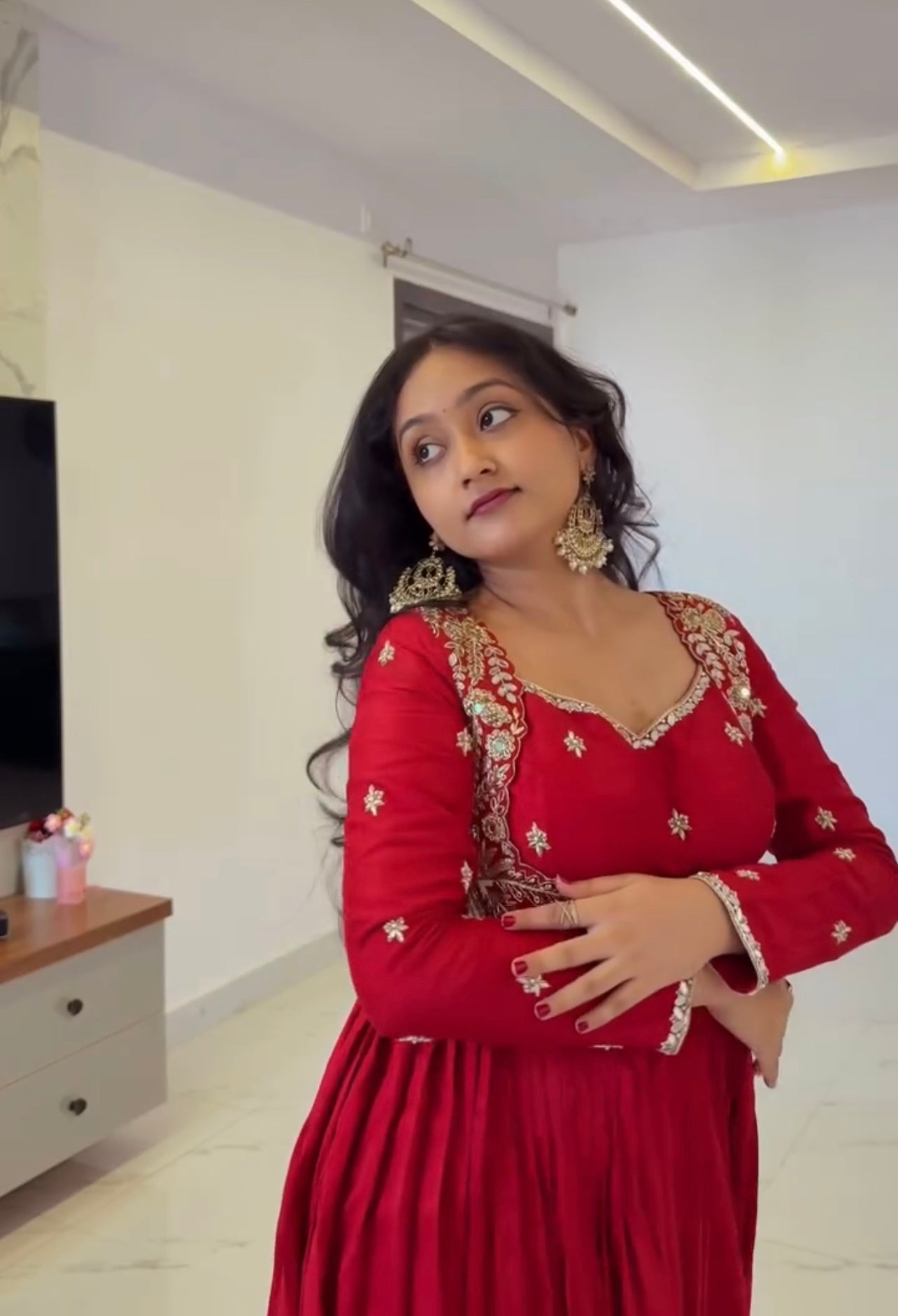 Step into regal elegance with this luxurious Chinon Silk Anarkali Pant Set, designed to make every celebration unforgettable. Available in rich Red and graceful Peach shades, this ensemble blends traditional craftsmanship with modern sophistication.
